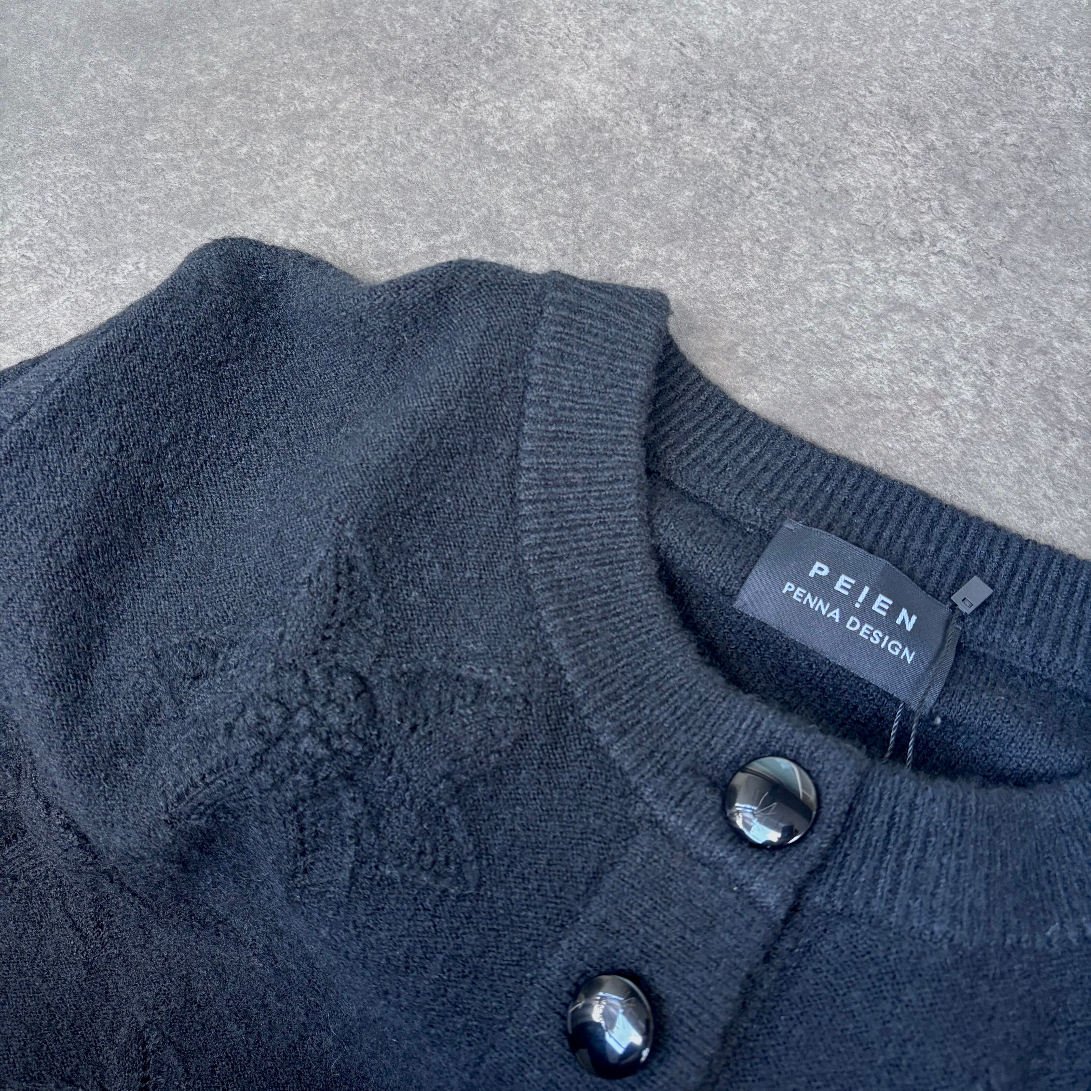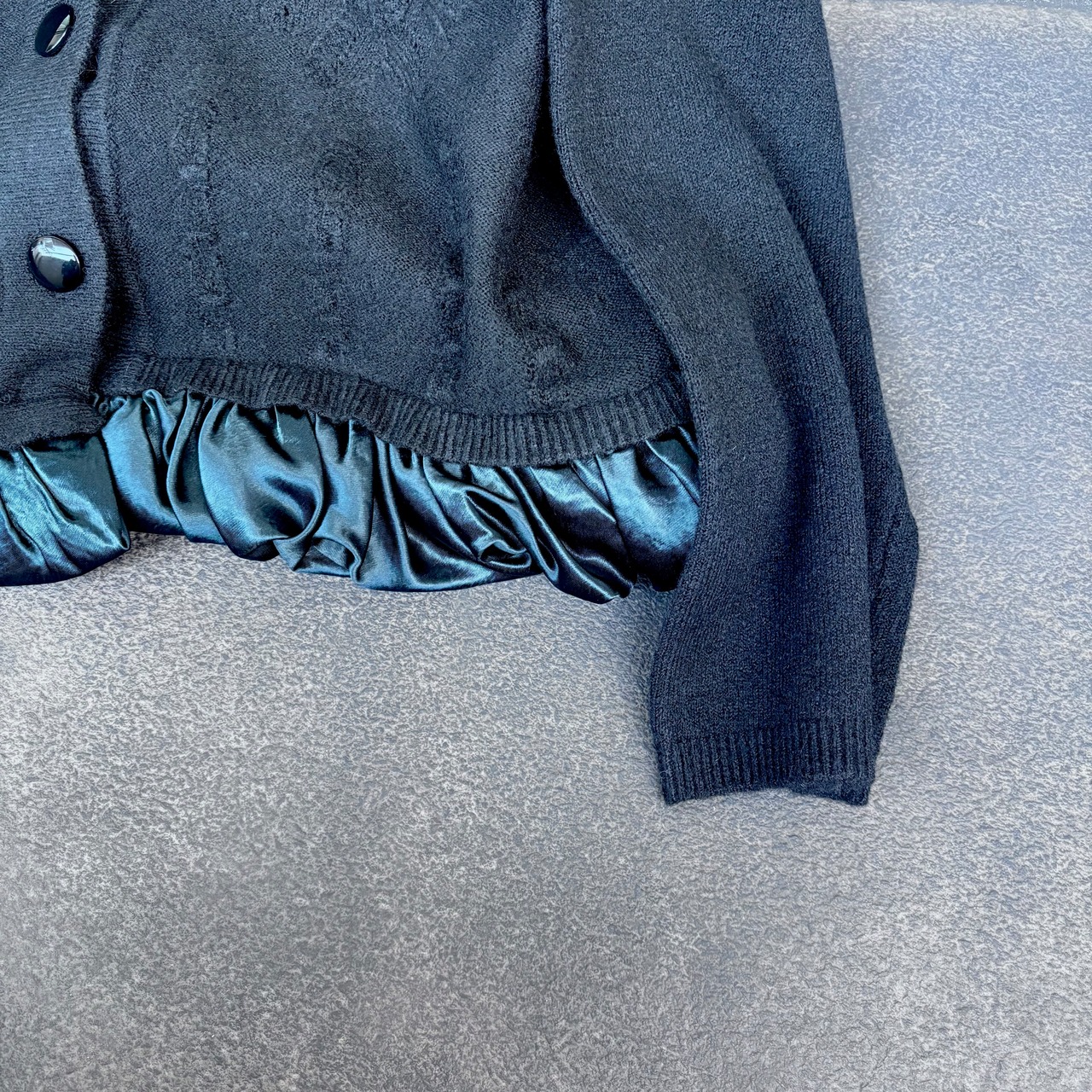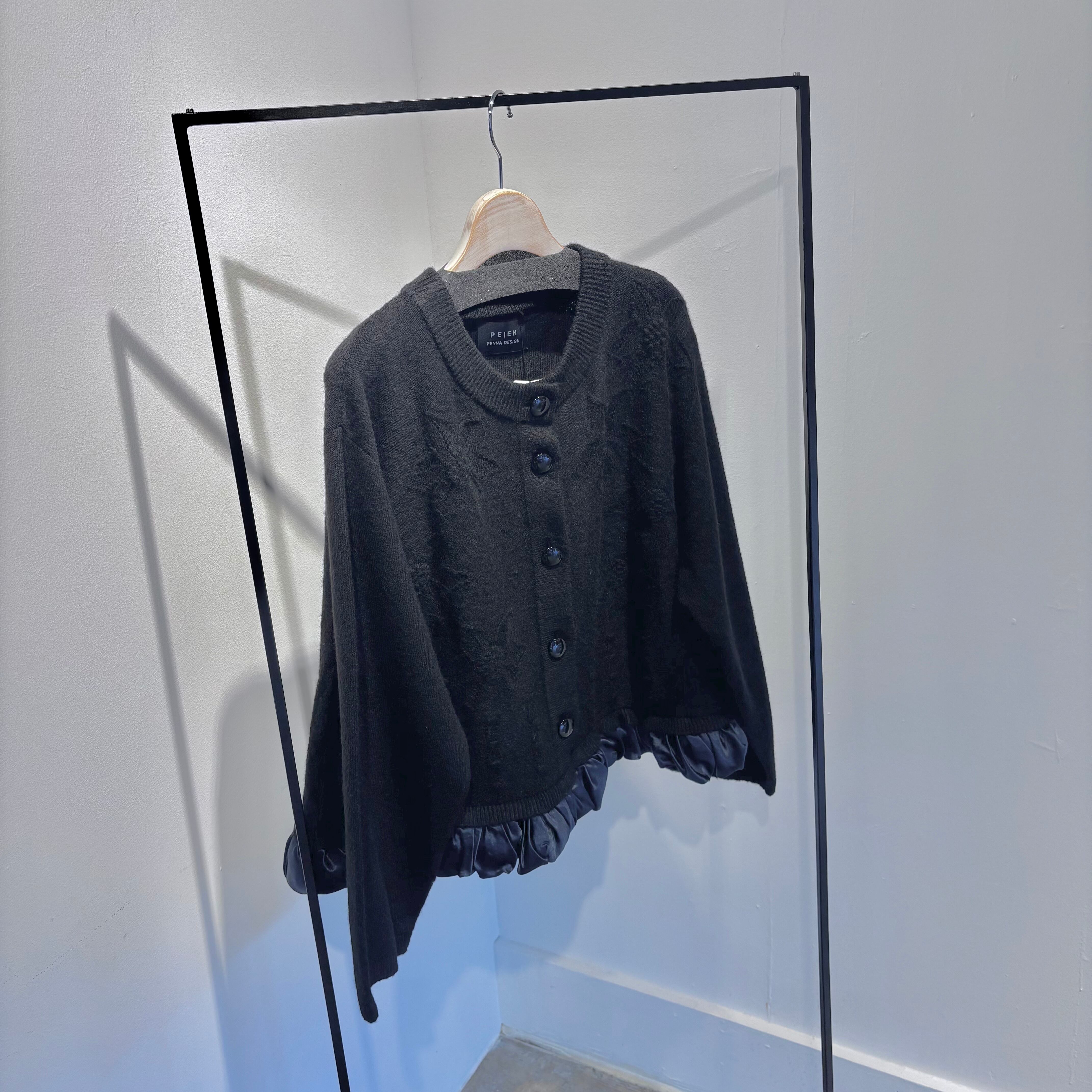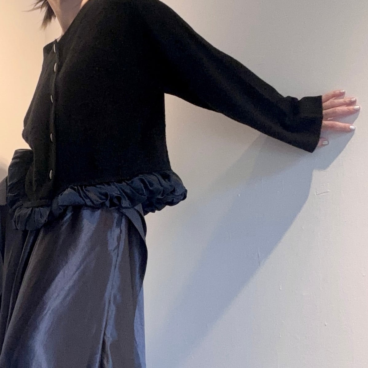ニットとサテンの異素材MIXが印象的なカーディガンです。