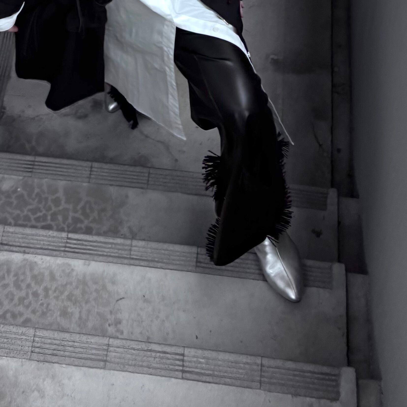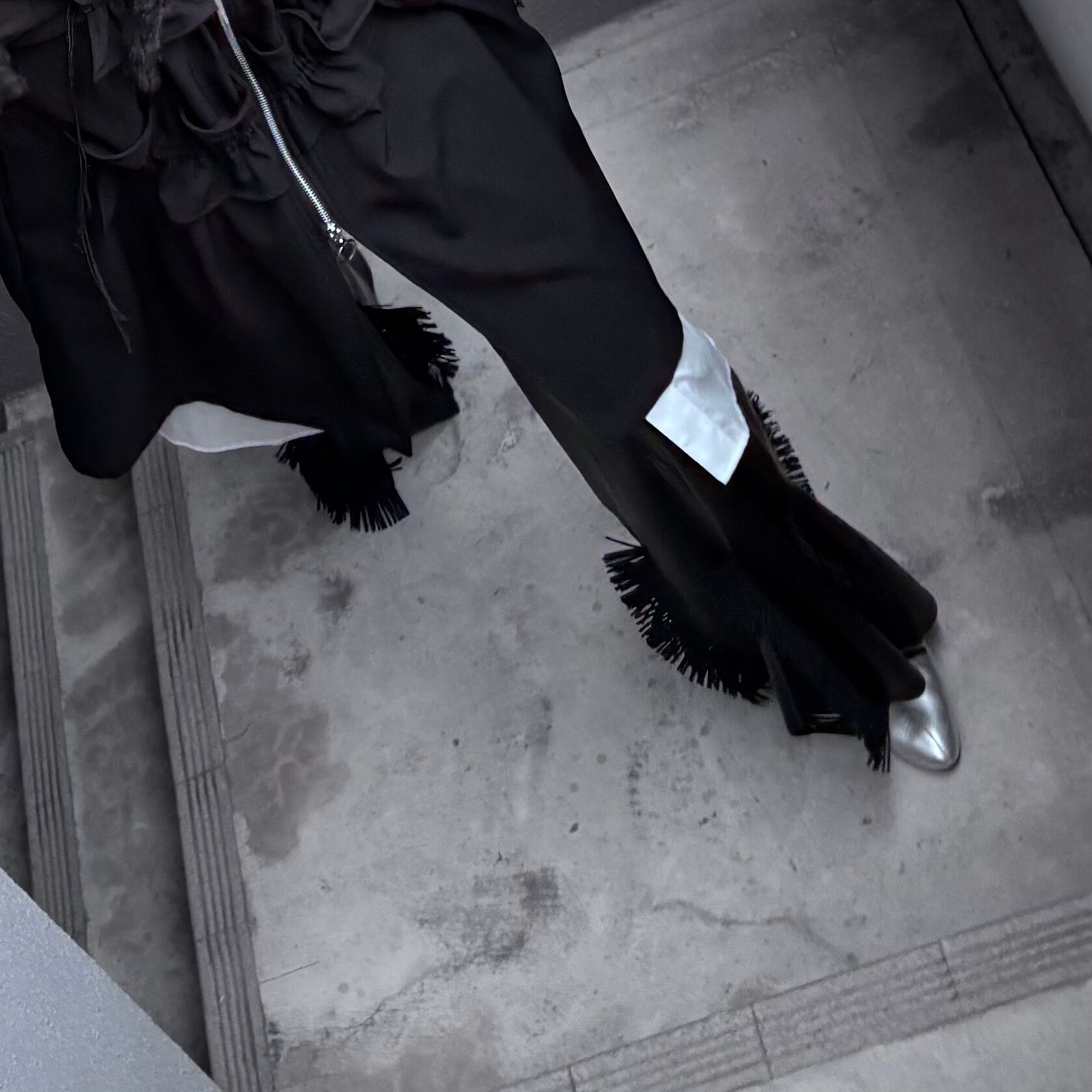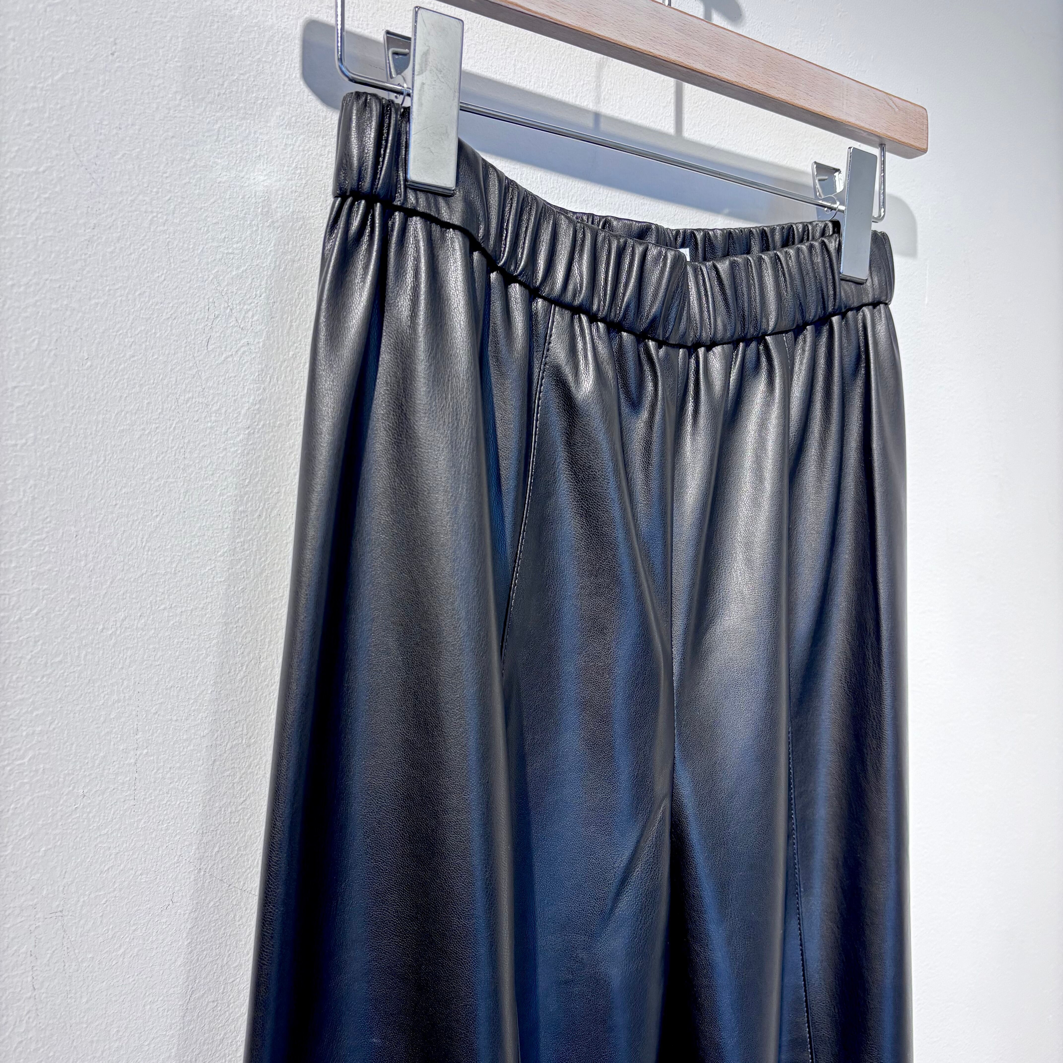 裾にフリンジがあしらわれたフェイクレザーのワイドパンツです。