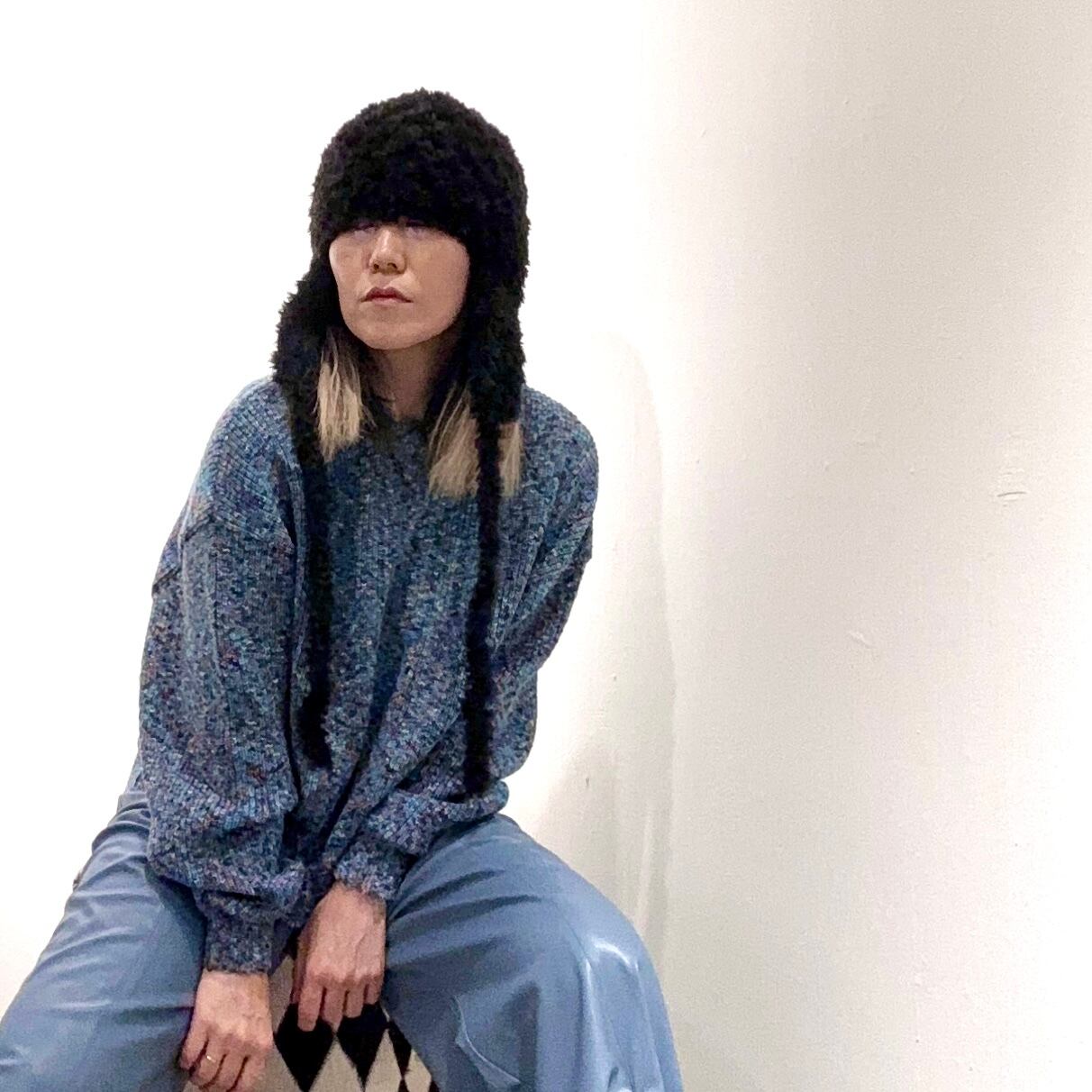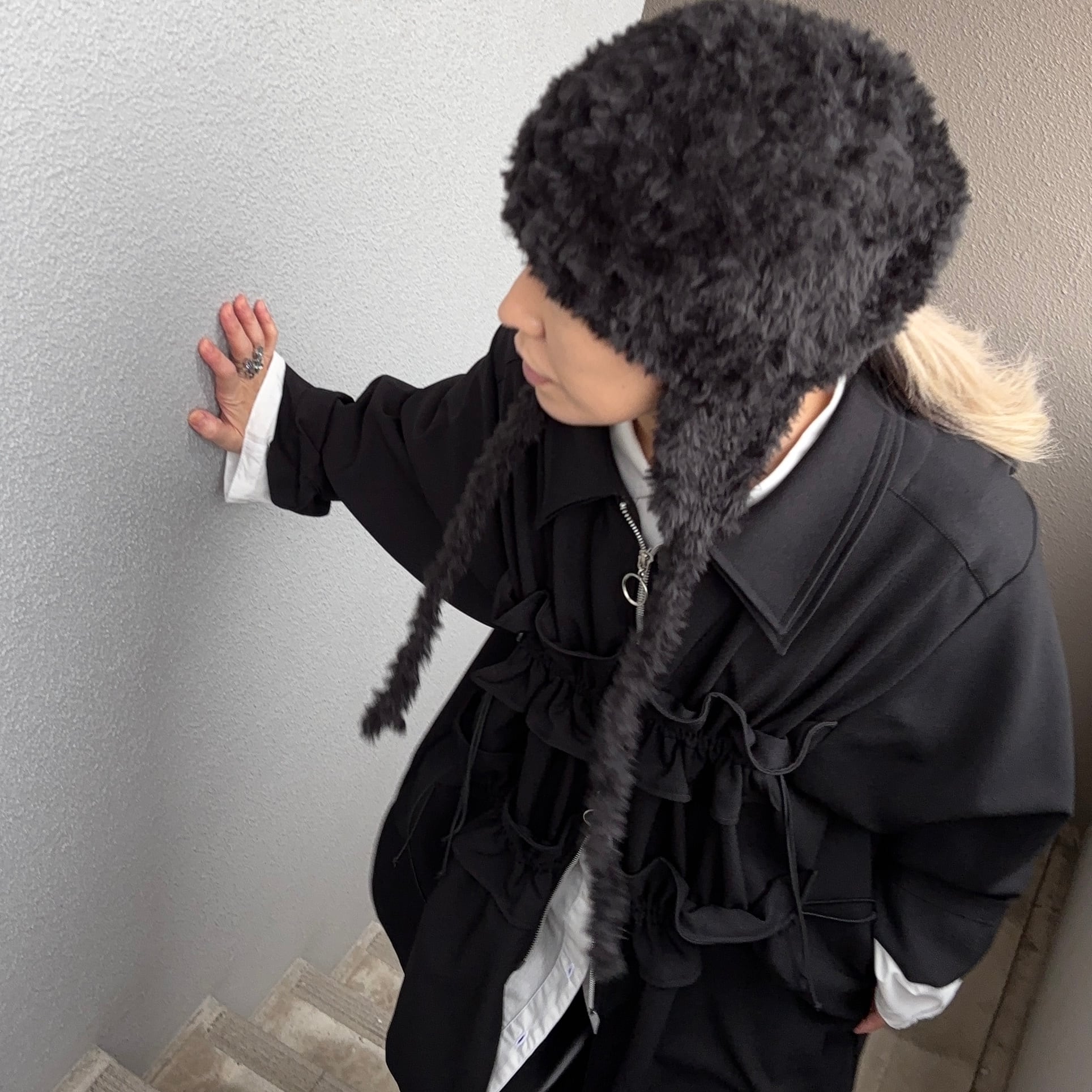 ふわふわとした肌触りの良い毛糸で編まれたエコファー耳当て付きのニット帽です。
