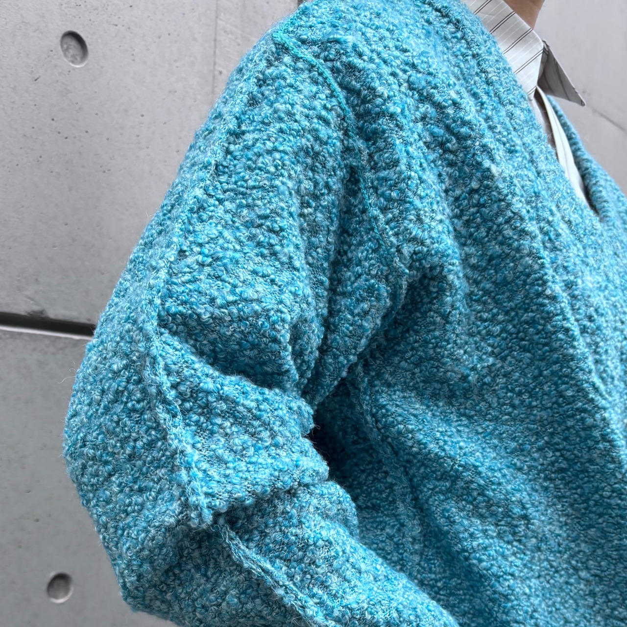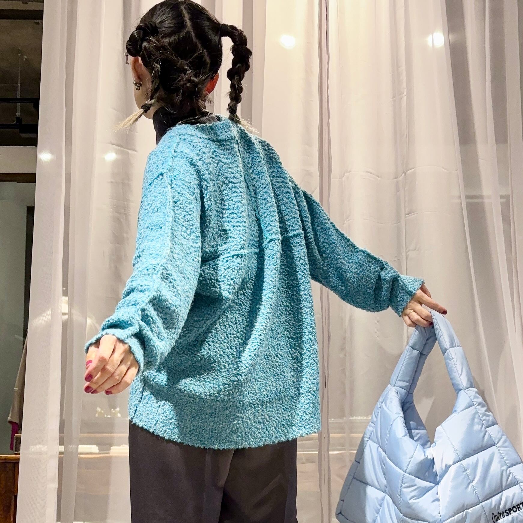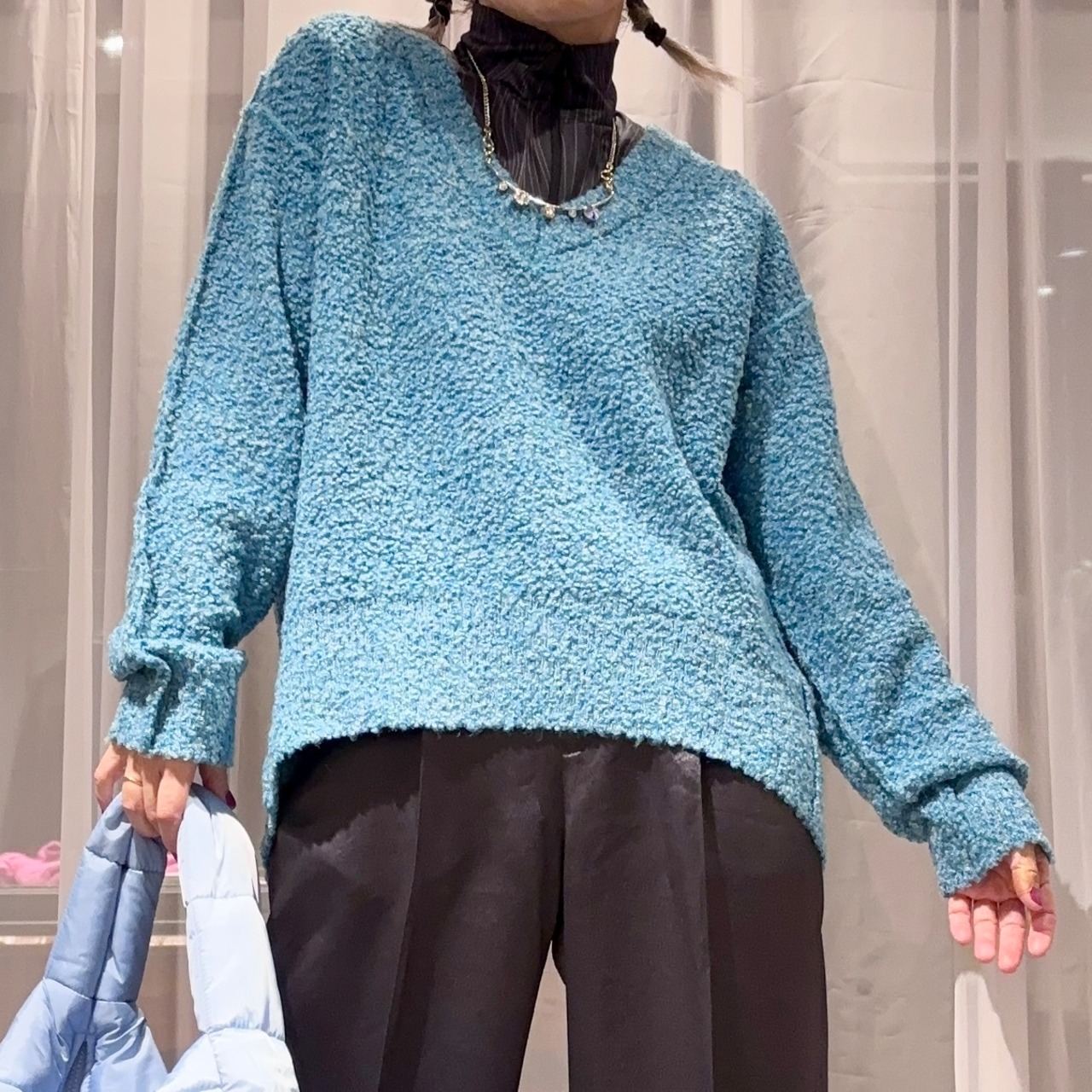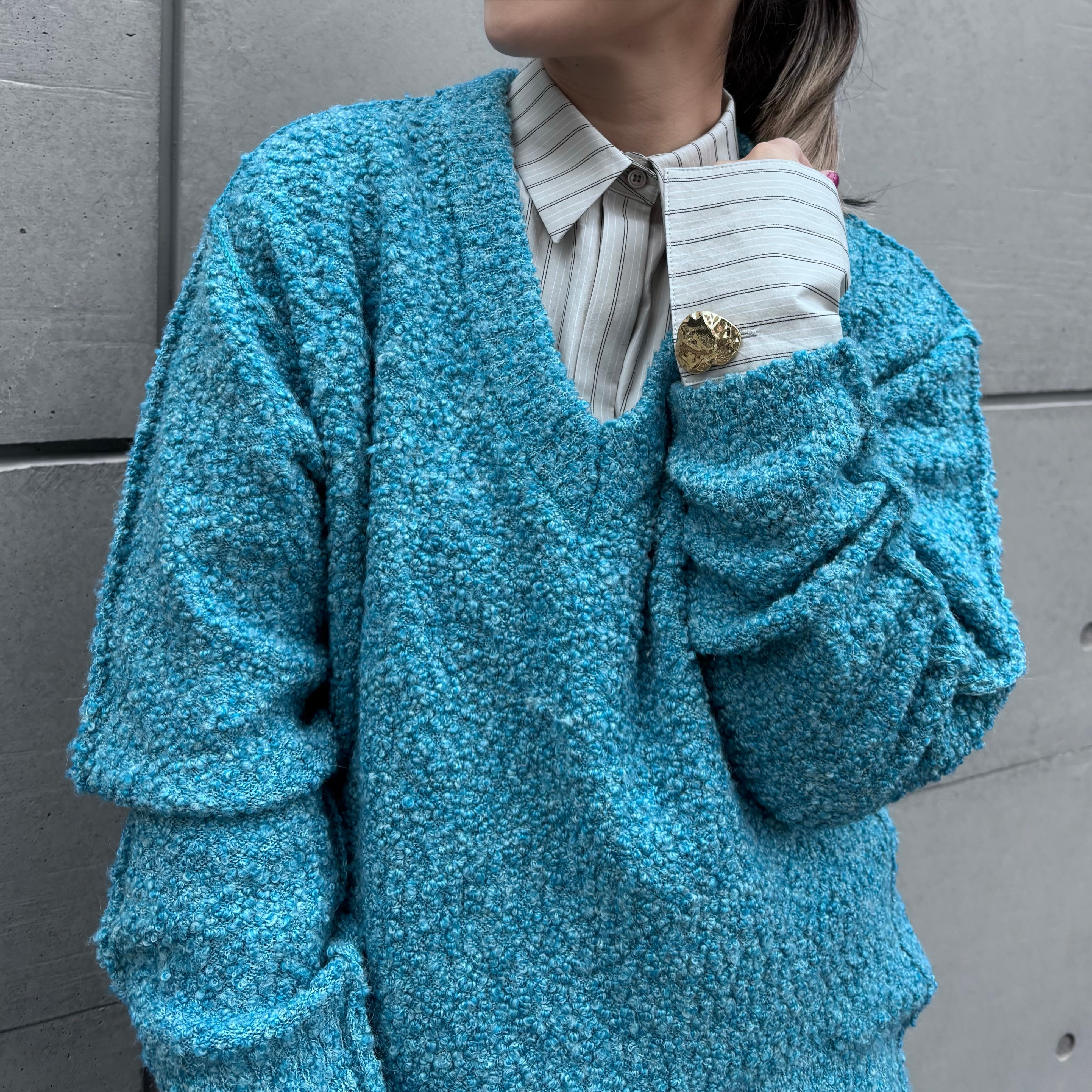 ネップのぽつぽつとした模様がかわいいVネックのニットです。