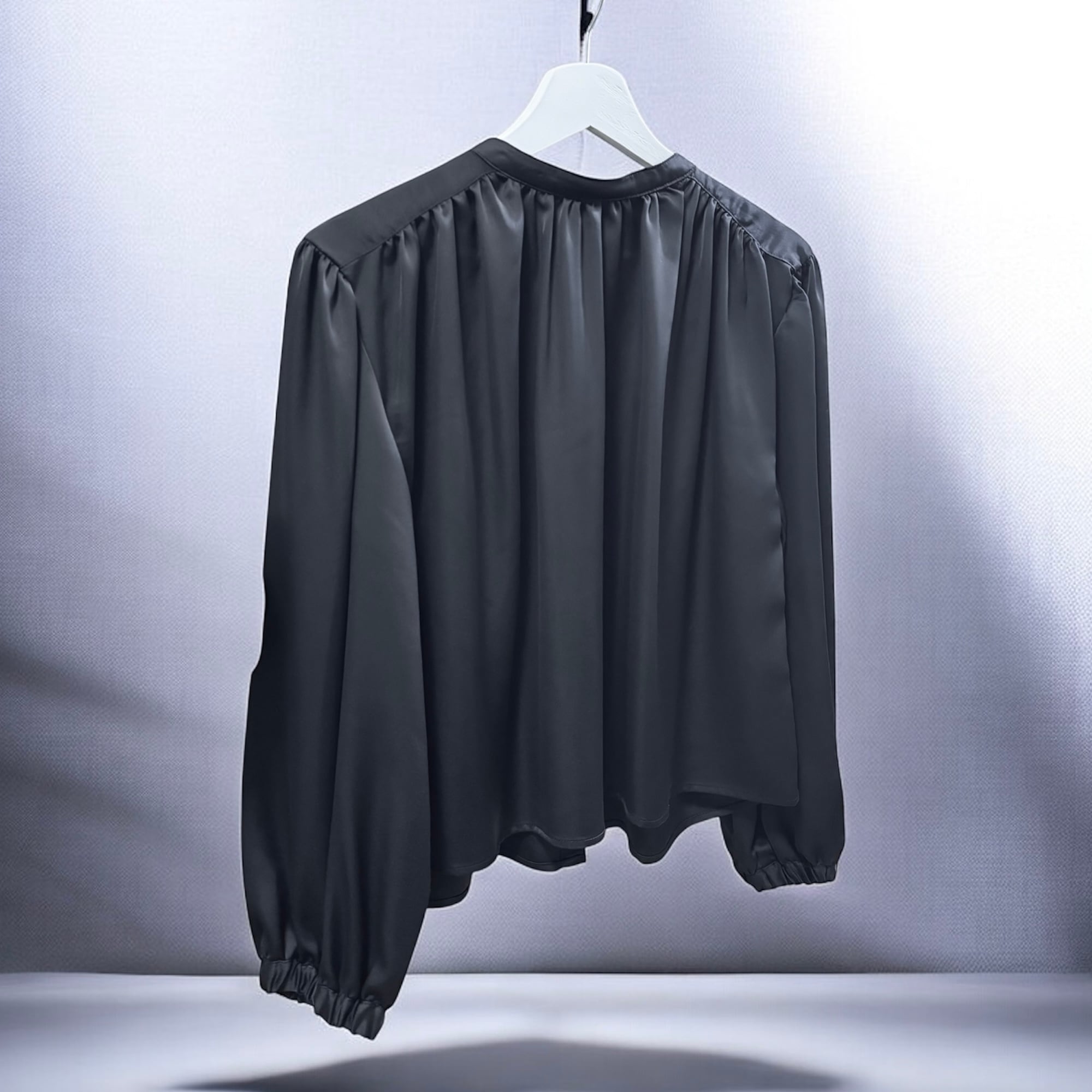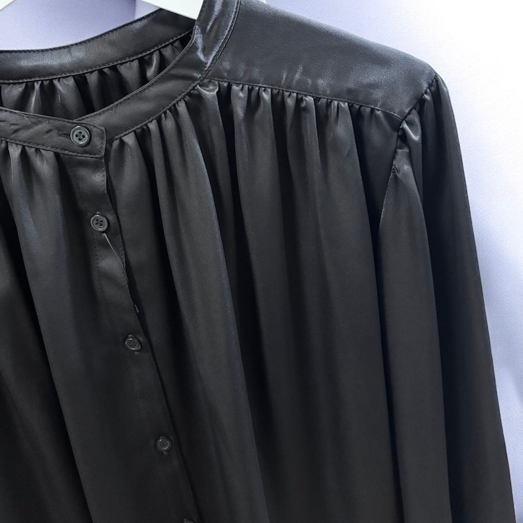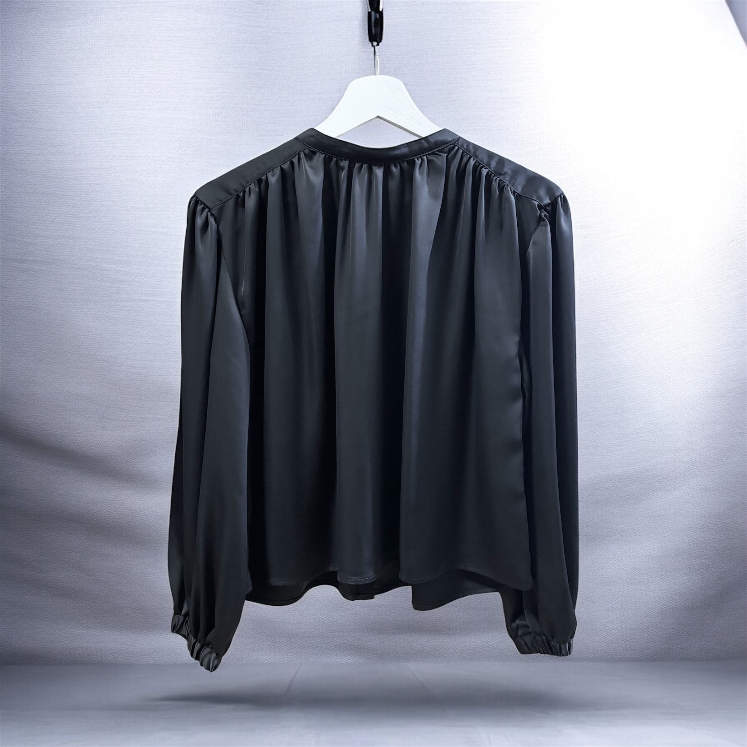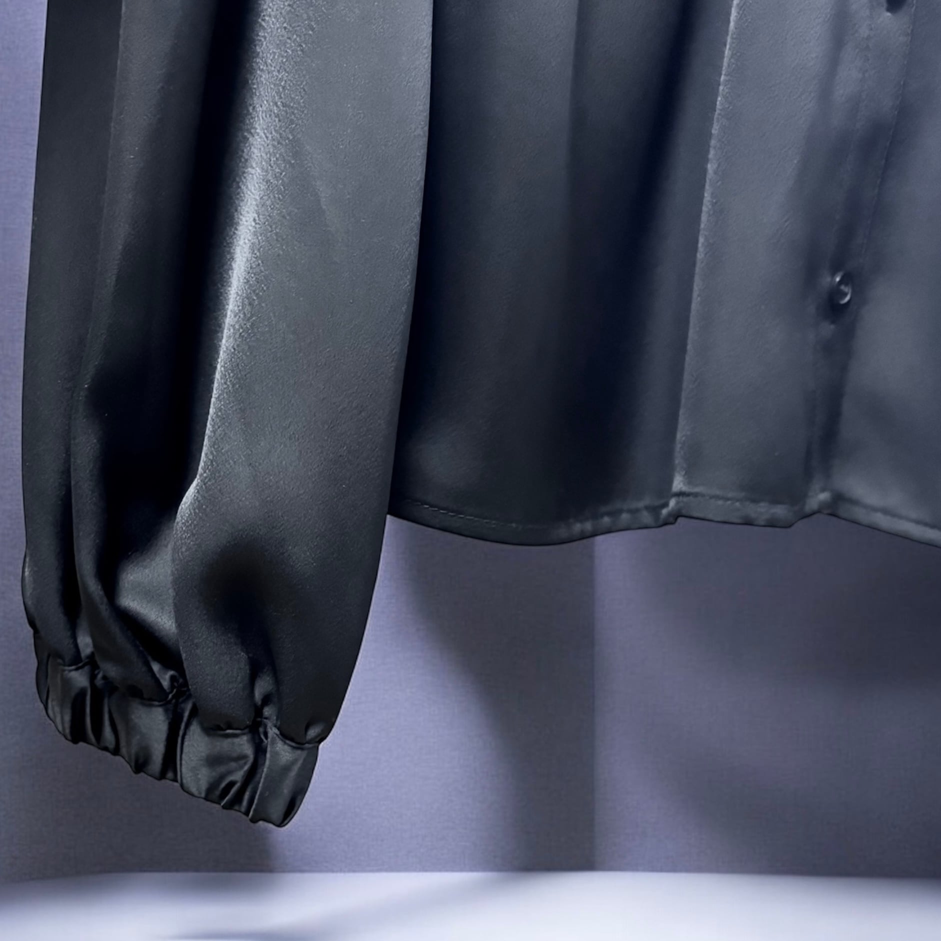 程よい光沢ととろみのある生地で幅広いシーンに活躍する上品さがありながら、ポリエステル100%でお手入れのしやすさだったり袖口のゴム仕様でデイリー使いの着心地の良さを兼ね備えた優秀アイテム。