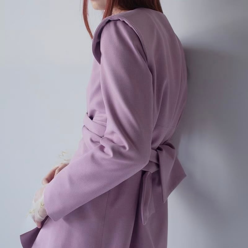 ノーカラー、ウエスト位置の高いシルエットは身体のラインを美しく見せ、